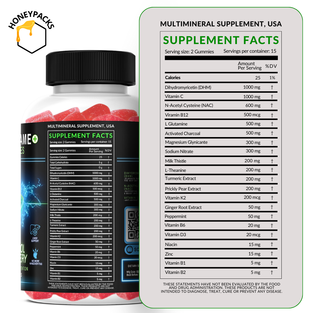 Meet Pregame Gummy, the ultimate wellness gummy designed to support your body before, during, and after your night out. Packed with a powerful blend of 20+ detoxifying and replenishing ingredients—including Dihydromyricetin (DHM), N-Acetyl Cysteine (NAC), Activated Charcoal, Milk Thistle, Prickly Pear Extract, and essential B vitamins—Pregame is your go-to gummy to help eliminate toxins, reduce mental fog, and accelerate recovery.
